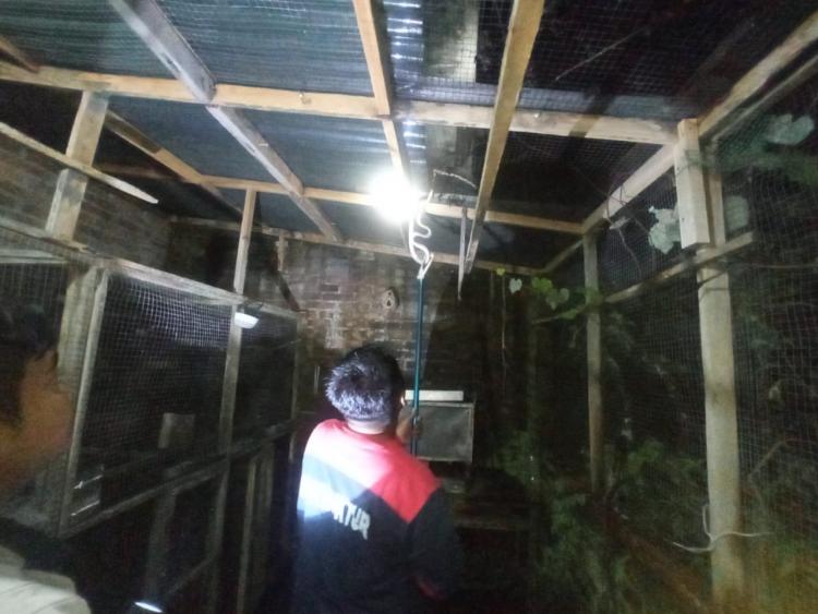 Ketika sedang beristirahat, ibu Vivi mendengar suara berisik dari kandang Burung miliknya. Setelah dimatai ternyata ada seekor ular menjulur masuk ke dalam kandang burungnya. Kemudian Ibu Vivi melapor ke Damkar Kab. Magelang.